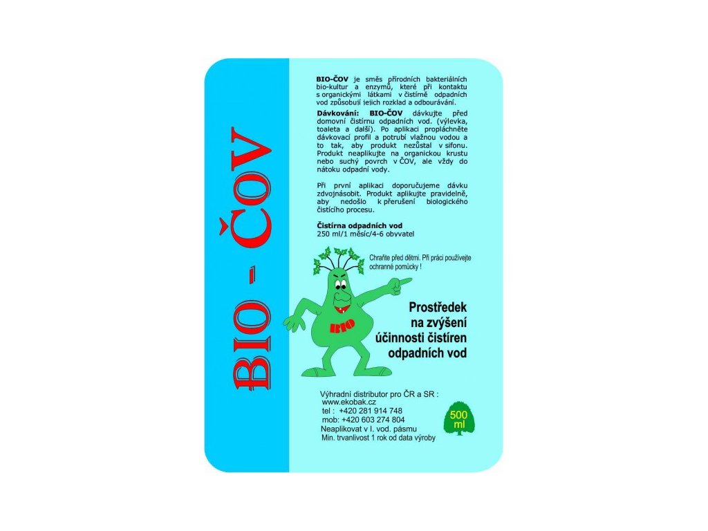 BIO-COV je ekologický produkt, který není toxický, agresivní, nezpůsobuje korozi. BIO-COV je určen pro malé domovní čistírny. Dávkování: BIO-COV dávkujte před domovní čistírnu odpadních vod. (výlevka, toaleta a další). Po aplikaci propláchněte dávkovací profil a potrubí vlažnou vodou a to tak, aby produkt nezůstal v sifonu. Produkt neaplikujte na organickou krustu nebo suchý povrch v ČOV, ale vždy do nátoku odpadní vody. Uvedené dávkování je orientační a při první aplikaci doporučujeme dávku zdvojnásobit. Čistírna odpadních vod 250 ml/1 měsíc/4-6 obyvatel Pro optimální efekt produktu nezapomínejte na pravidelné dávkování Upozornění: během dávkování nepoužíváme dezinfekční prostředky. (kyseliny, louhy, domácí chemii) Při práci dodržujte základní hygienická pravidla, chraňte před dětmi, neaplikovat v I. vodním pásmu balení: 500 ml, 5 l, 25 lminimální trvanlivost 1 rok od data výrobyDoplňkové parametry